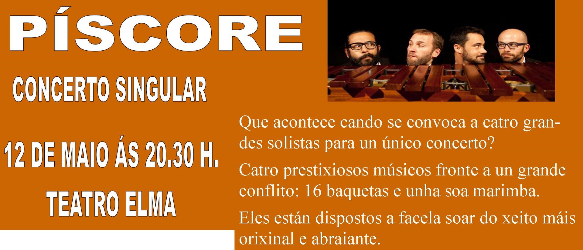 A compañía Píscore presenta  o seu Concerto singular. Catro percusionistas que sen necesidade de palabras dan o mellor de si sobre o escenario. Un só instrumento, a marimba, para repartir entre todos eles, é o fío condutor desta comedia musical. Oito mans, dezaseis baquetas e un só instrumento sobre o escenario. Sen dúbida, o de hoxe trátase dun concerto singular.