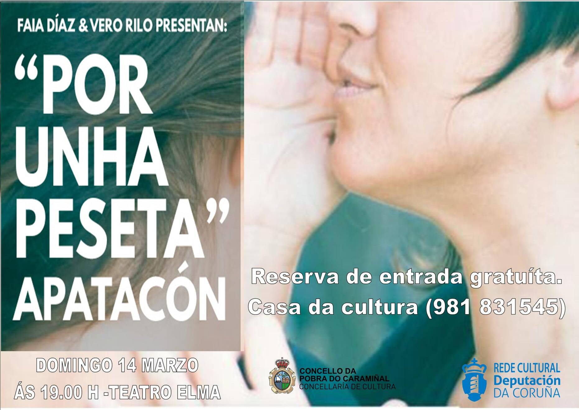 A compañía Apatacón trae ao Elma neste domingo 14, ás 19.00 horas, o espectáculo Por unha peseta. Un traballo onde a voz narrada e cantada se achegan para atopar canto vale unha peseta. Historias da vida recollidas no noso contorno e que nos achegan en partes iguais ao humor, á sensibilidade e á tenrura propias da nosa xente.