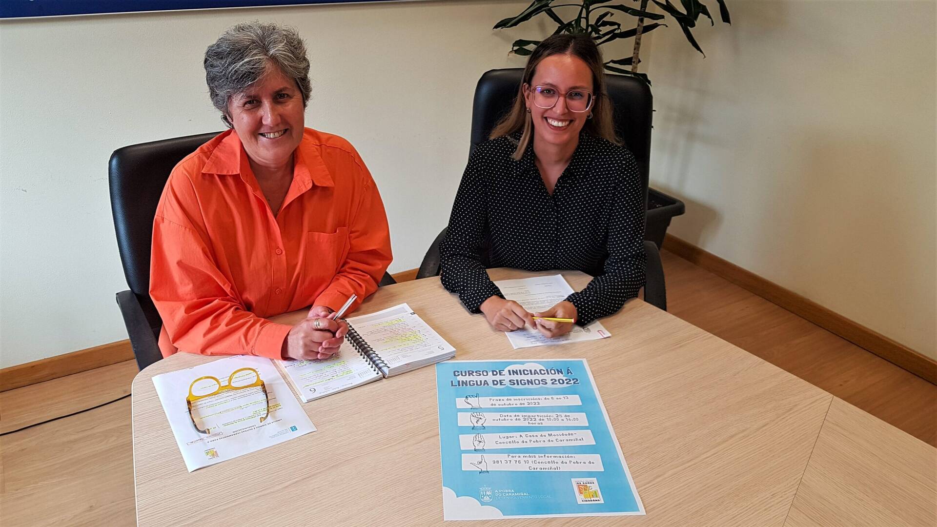 A adquisición de nocións básicas sobre a comunicación mediante a lingua de signos e o fomento da inclusión son os dous eixos desta acción formativa que presenta a concelleira do Desenvolvemento Local, Amparo Cerecedo (BNG), acompañada da orientadora laboral do Concello, Blanca Álvarez.