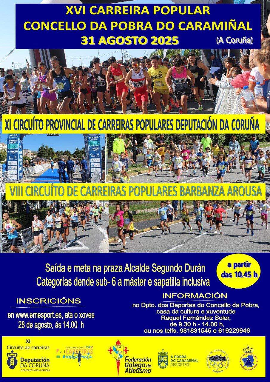 A XVI Carreira Popular Concello da Pobra do Caramiñal dará comezo o domingo 31 de agosto ao XI Circuito de Carreiras Populares Barbanza Arousa, enmarcada no XVI Circuito Provincial de Carreiras Populares da Deputación da Coruña.