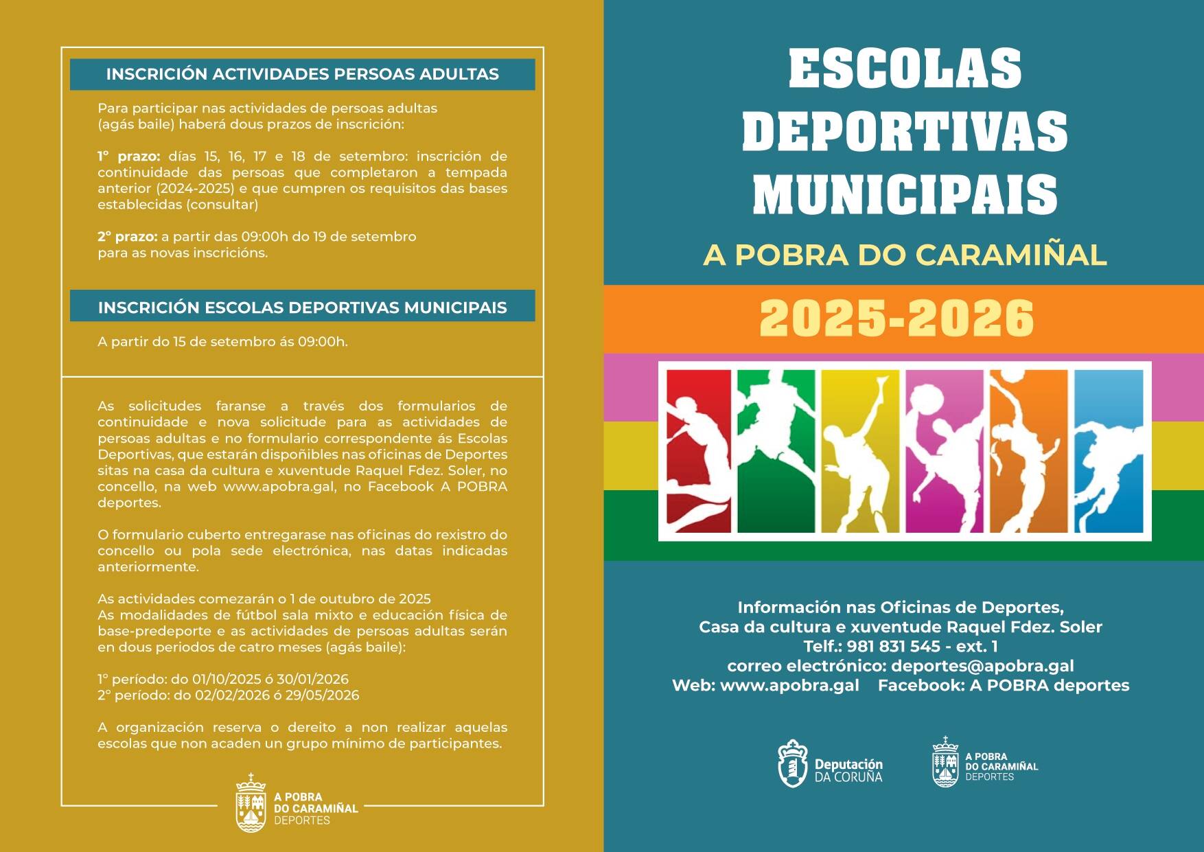 Os veciños e veciñas que precisen máis información poderán achegarse ás oficinas de Deportes e contactar no teléfono 981 831 545 (extensión 1) ou no correo deportes@apobra.gal.