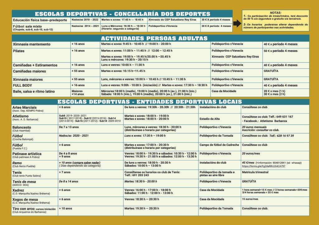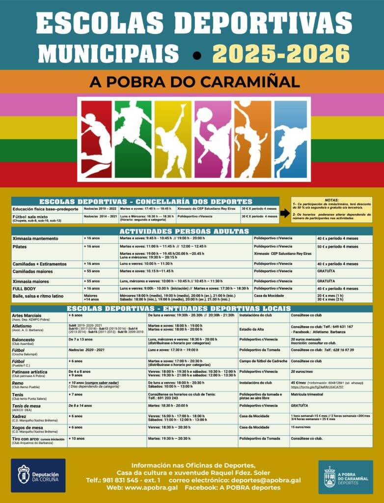 A programación deportiva na Pobra para o curso 2025-2026 será variada e, grazas á colaboración coas entidades e clubs deportivos, a rapazada poderá gozar das seguintes disciplinas: