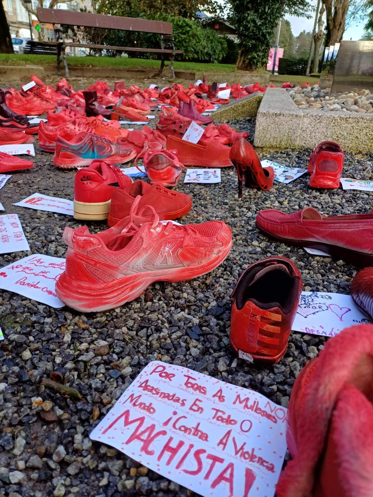 ‘Non ao medo a entrar na casa’, ‘xa non máis dor’ e ‘por todas as mulleres asasinadas no mundo’. Contra a violencia de xénero’. Esas son, unicamente, algunhas das frases poden lerse no monumento en honor ás vítimas de violencia de xénero dos xardíns Valle-Inclán. Detrás destes traballos, que forman parte da exposición ‘Zapatos vermellos’, atópase o alumnado de primaria do CEP Plurilingüe Salustiano Rey Eiras e do CEP Plurilingüe Pilar Maestu Sierra.