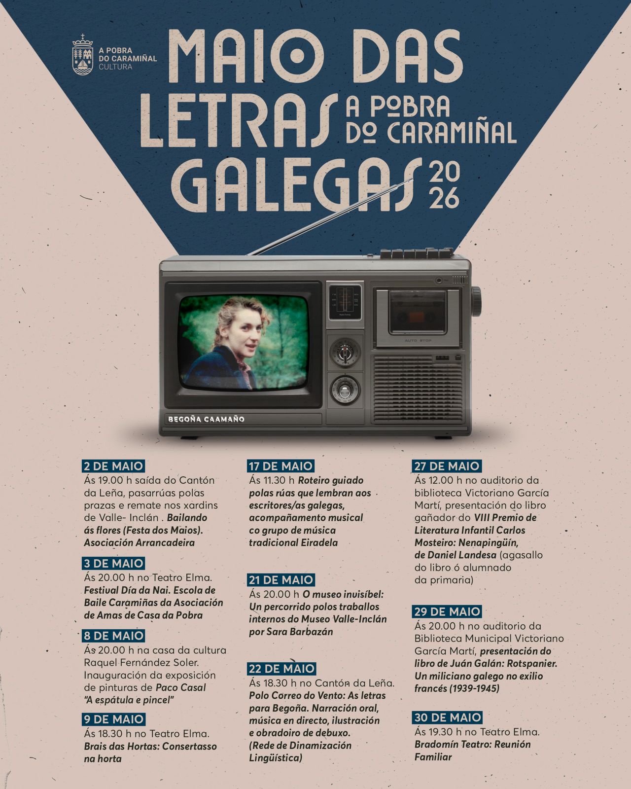 O Concello da Pobra do Caramiñal volve apostar, un ano máis, por unha ampla e diversa programación cultural para o mes de maio, coincidindo coa conmemoración das Letras Galegas. Música, danza, literatura, exposicións completan un amplo abano de actividades pensadas para todos os públicos.