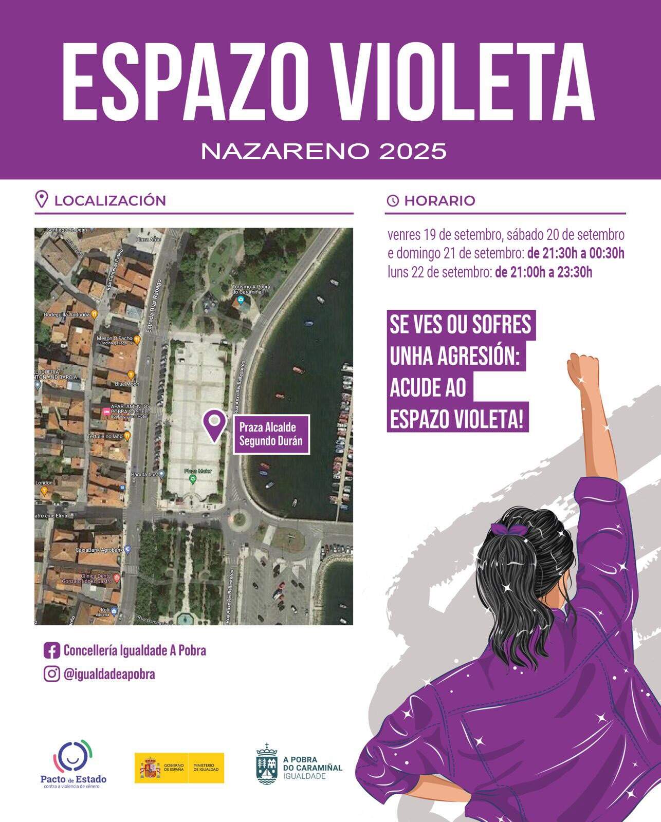 En cuanto al horario, el Espacio Violeta funcionará del viernes, 19 de septiembre, al domingo, día 21, de 21.30 a 00.30 horas. El lunes, día 22, estará operativo entre las 21.00 y las 23.30 horas. El Concello colocó planos con la localización y horarios de este puesto en los establecimientos hosteleros colaboradores.