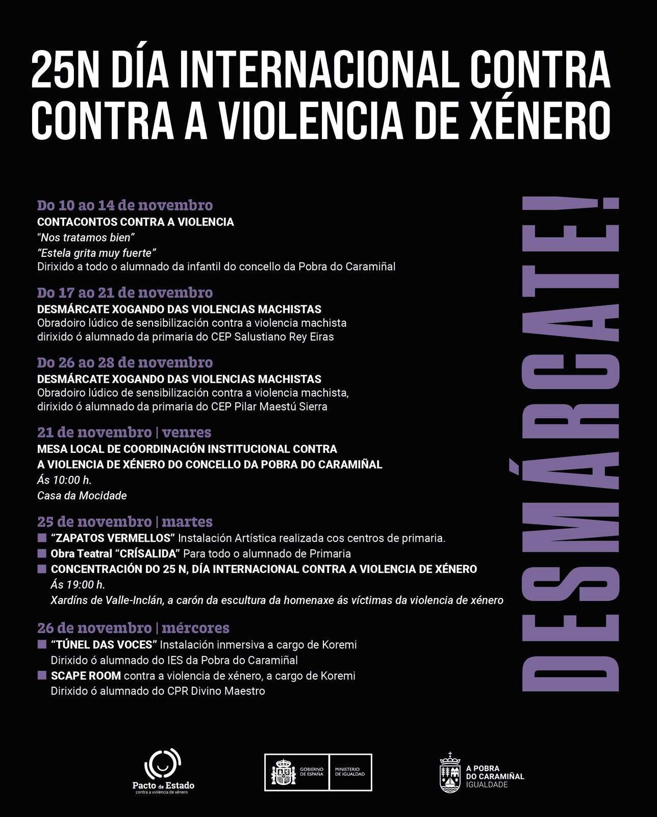 Desmárcate! de la violencia de género. Ese es el eje y lema central de la nueva campaña que la Concellería de Igualdade pone en marcha para conmemorar el 25 de noviembre (Día Internacional de Lucha contra la Violencia de Género). La concejala, Estefanía Ramos, presentó el programa de la nueva edición, muy centrado en concienciar y sensibilizar “ás novas xeracións, peza clave na erradicación desta lacra social”, explicó. La programación incluye cuentacuentos, talleres de sensibilización, representaciones artísticas, teatro e incluso un scape room sobre la violencia machista.