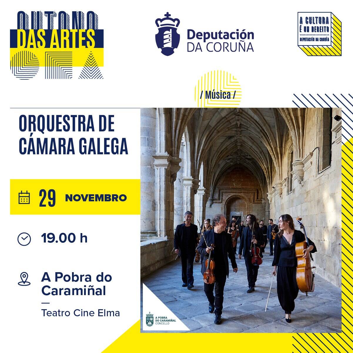 El sábado, 29 de noviembre, a las 19.00 horas a Orquestra de Cámara Galega aterrizará en el Teatro del Cine Elma como parte del programa Outono das Artes da Deputación da Coruña. Tras su reciente 27 aniversario, la agrupación llegará al municipio con repertorios nuevos en los que se incluyen temas barrocos y otros contemporáneos. Todo con un hilo conductor: dar a conocer la música de compositores gallegos, con una especial mención a la obra de Rogelio Groba Groba.
