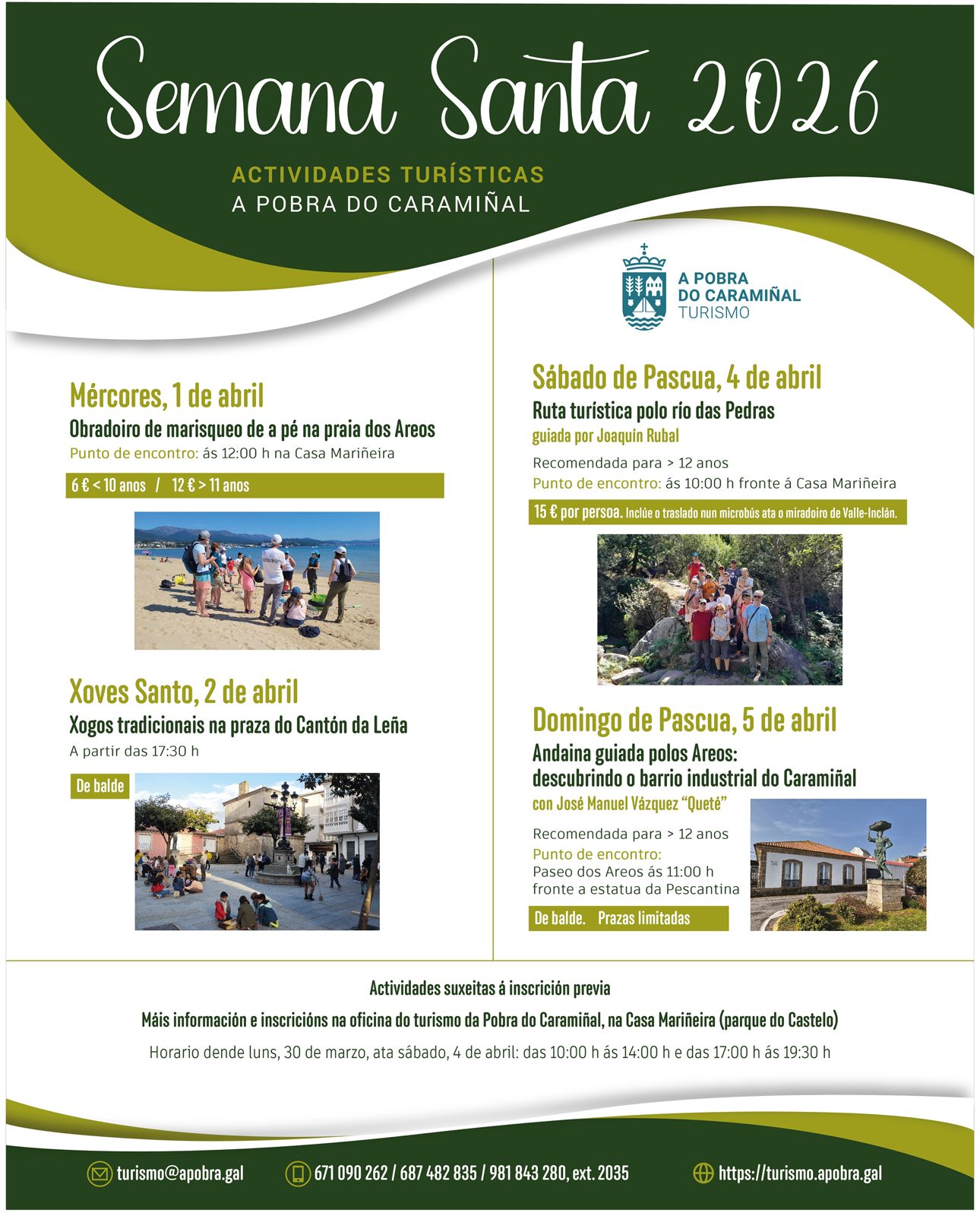 A Pobra do Caramiñal dio a conocer esta mañana su programación de actividades turísticas para la Semana Santa 2026. Se trata de una propuesta que incluye cuatro iniciativas y está pensada para poner en valor el patrimonio natural, histórico y cultural del municipio.
